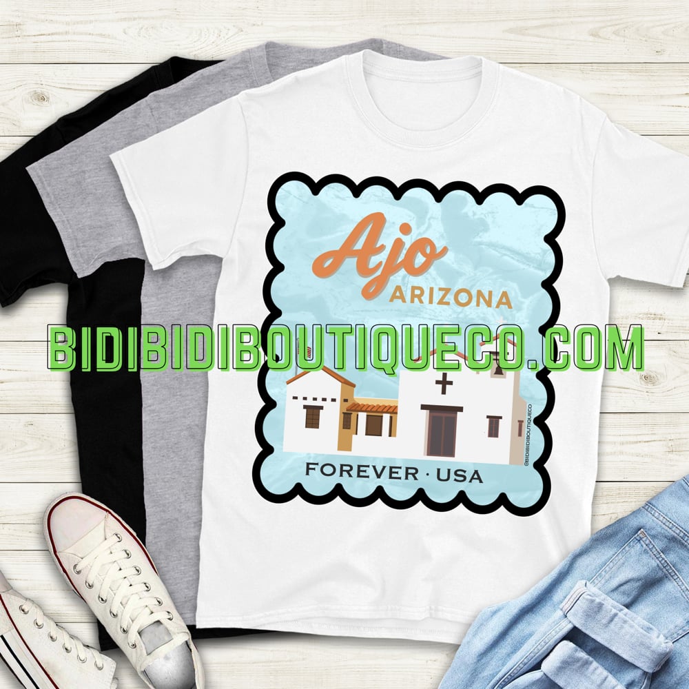 Celebrate the charm of the Southwest with this vintage-style “Ajo, Arizona” graphic tee, featuring a nostalgic illustration of the town’s iconic mission-style architecture. Made from soft, high-quality cotton for all-day comfort.